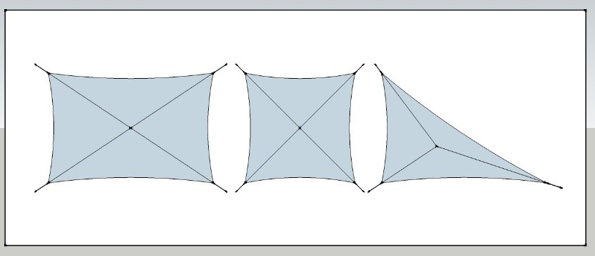 Tension Afin qu’aucun pli ne se forme lors de la mise sous tension, il est nécessaire que les points de tir soient situés dans l’axe des diagonales des voiles à 4 côtés et dans l’axe des médianes des voiles à 3 côtés. |